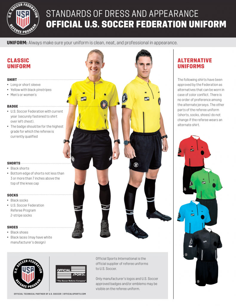 The following is the current USSF Uniform. Referees are required to wear the uniform for all USSF approved games as well as their badge with the current year displayed. Referees may order the uniform from officialsports.com or Amazon.com.